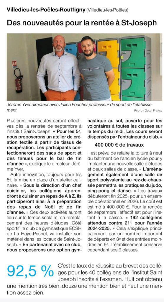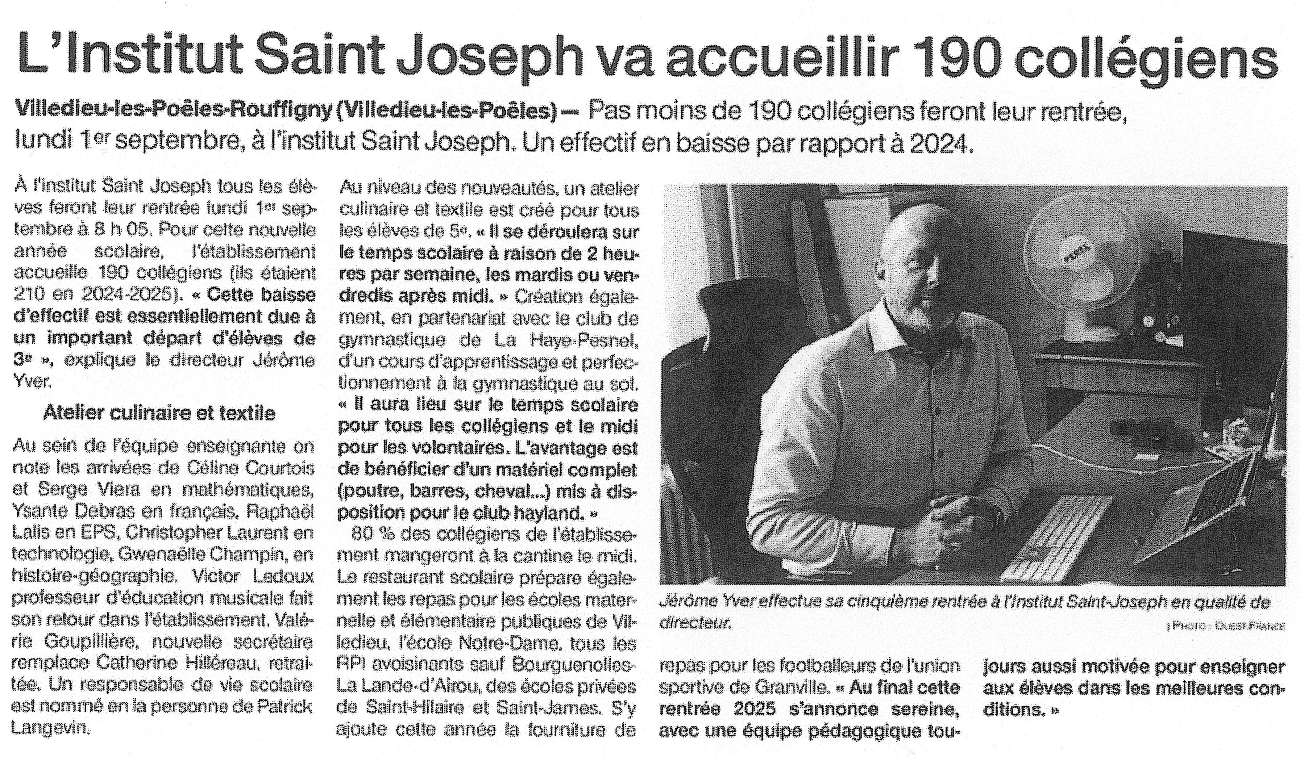 Jérôme Yver est le directeur de l’institut Saint-Joseph, à Villedieu-les-Poêles-Rouffigny (Manche), depuis 2021. | Lire l'article sur OUEST-FRANCE